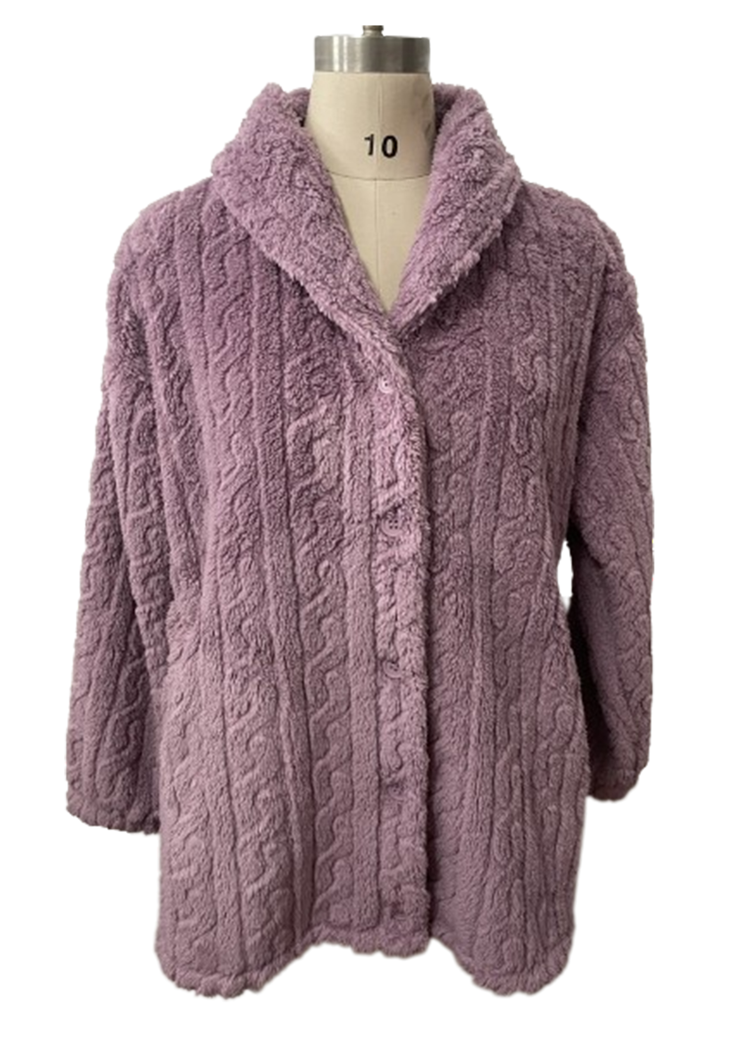 Bata corta de mujer de color rosa con bolsillos laterales interiores y cierre con botones.