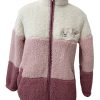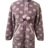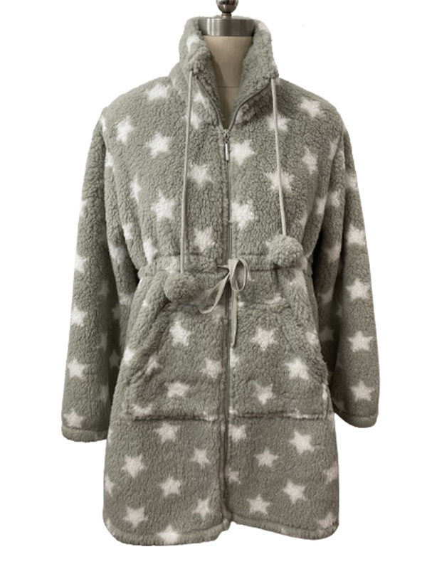 Bata corta de mujer de color gris con estampado de estrellas blancas. Con dos bolsillos exteriores, goma en la cintura, cierre de cremallera y dos cordones en el cuello con dos pom poms.
