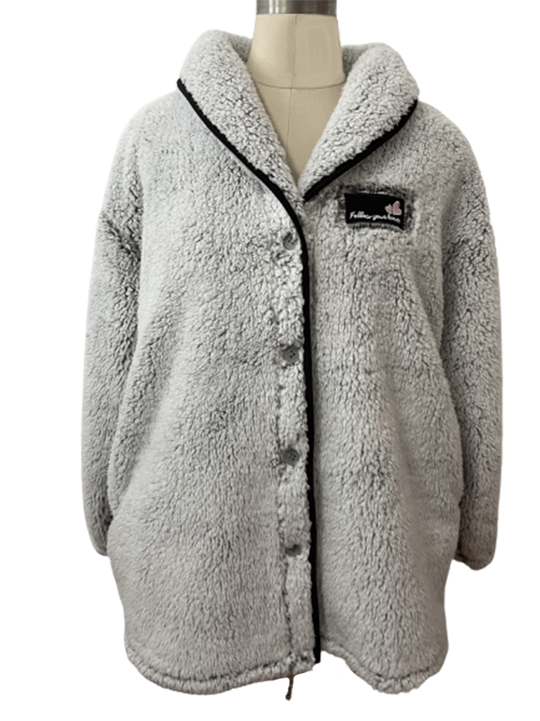 Bata corta de mujer de color gris con bolsillos laterales interiores, cierre con botones y bordado en el pecho Follow your heart.