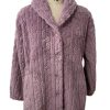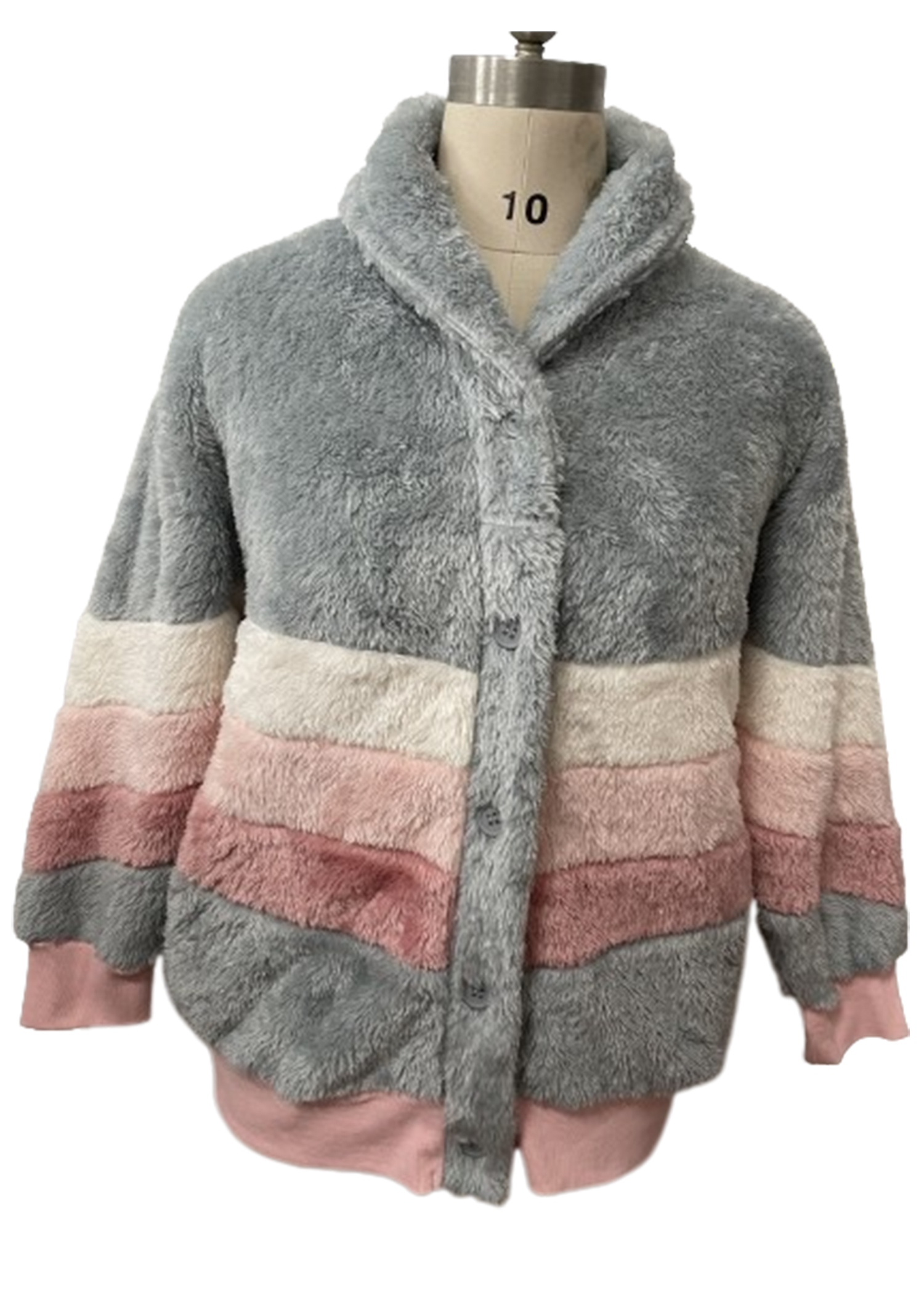 Bata corta de mujer de color gris claro y franjas de colores con bolsillos laterales interiores y cierre con botones.